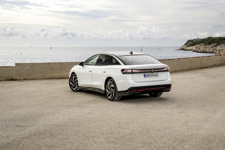 O pohon sa stará celkom nový elektromotor s výkonom 210 kW (285,6 k) a 545 Nm. Mimochodom, tento motora sa od februára 2024 objaví aj v modeloch ID.4 a ID.5 a v júli aj v ID.3. Samotný motor je trojfázový synchrónny s budením permanentnými magnetmi a vyznačuje sa mimoriadnou efektivitou. Oproti pôvodnému elektromotoru, ktoré VW v modeloch ID využíval doteraz, má kombinované chladenie vodou a olejom, čo mu zabezpečuje oveľa vyššiu tepelnú stabilitu. To znamená aj vyššiu stabilitu výkonu. Vysoká stabilita výkonu, veľmi vysoká efektivita a veľmi dobrá aerodynamika spôsobili, že si konštruktéri mohli dovoliť maximálnu rýchlosť až 180 km/h. Pre info, veľa elektromobilov má maximálku obmedzenú na 160 km/h, a to nielen preto, žeby potom mali vysokú spotrebu, ale aj práve kvôli tomu, aby predišli prehrievaniu motora. Akumulátor má nominálnu kapacitu 82 kWh, z toho využiteľných 77 kilowatthodín a pri spotrebe 14,3 – 16,1 kWh/100 km má ID.7 dojazd podľa WLTP až 621 km. Vstavaná nabíjačka na striedavý prúd má výkon 11 kW, z jednosmernej nabíjačky si vie potiahnuť až 175 kW. Za ideálnych podmienok by ste mali z 10 na 80 % dobiť svoj akumulátor za 28 minút. Inými slovami, v rozsahu 10 – 80 % kapacity akumulátora by ste za 10 minút mali dotankovať energiu na ďalších 204 km. To za predpokladu využívania funkcie predohrevu akumulátora, ktorú môžete aktivovať automaticky tým, že zadáte do navigácie ako cieľ nabíjaciu stanicu, ale aj vtedy, keď vám pri dlhších cestách sama navigácia zaradí do trasy nabíjací bod alebo aj manuálne. A o tom, že to nie je zbytočná funkcia hovorí skutočnosť, že predohrev akumulátora skráti čas nabíjania o 10 – 15 minút a zároveň prispeje k menšiemu „opotrebovaniu“ akumulátora. Vpredu je zavesenie typu McPherson, vzadu „päťprvok“, konštruktéri venovali mimoriadnu pozornosť riadeniu. V opcii je dostupné progresívne riadenie a tiež adaptívne tlmiče DCC.