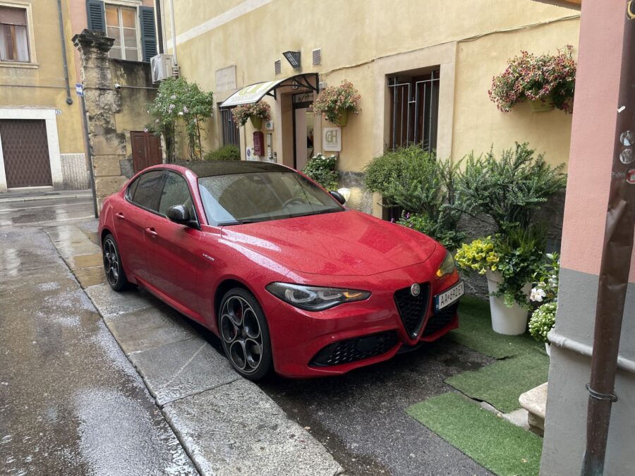 Po dohode so Slovenským importérom značky Alfa Romeo sme sa na cestu vydali s elegantnou Giuliou s benzínovým štvorvalcom 206 kW (280 k) s 8-stupňovou automatickou prevodovkou a pohonom všetkých kolies Q4. Inými slovami – bez najmenších obáv o dynamiku, pohodlie, či schopnosť prekonávať aj veľmi nepriaznivé podmienky na ceste. Múzeum Alfy Romeo ja v bezprostrednej blízkosti Milána, v mestečku Arese. Pretože z Bratislavy je vzdialené takmer tisíc kilometrov, rozhodli sme sa po ceste zastaviť na dva dni v historickom meste Verona. A neľutovali sme – väčšinu času pršalo, takže štvorkolka si na kľukatých cestách i na diaľniciach prišla na svoje!