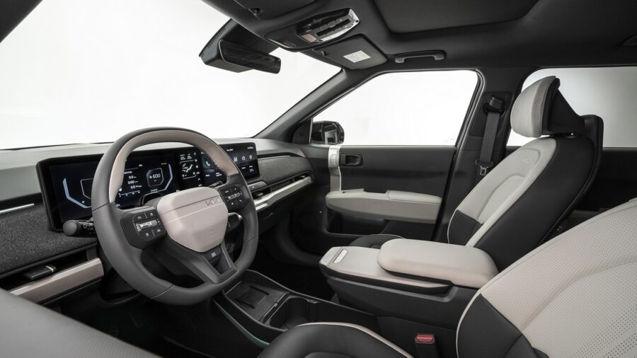 Auto má na dĺžku 4 300 mm, ale rázvor osí náprav dosahuje 2 680 mm a z toho vyplývajú dve veci. Tou prvou je, že v meste nebude ako slon v porceláne, tou druhou zasa, že pasažierom poskytne veľký vnútorný priestor. Samotná automobilka hovorí o kabíne ako o otvorenom vnútornom priestore, ktorý kladie dôraz na relax počas každej cesty. Prístrojovej doske dominujú dva 12,3-palcové displeje, jeden 5,3-palcový medzi nimi a všetky dohromady tvoria jednu ultraširokouhlú obrazovku. Štvrtým do partie je 12,3-palcový head-up displej.