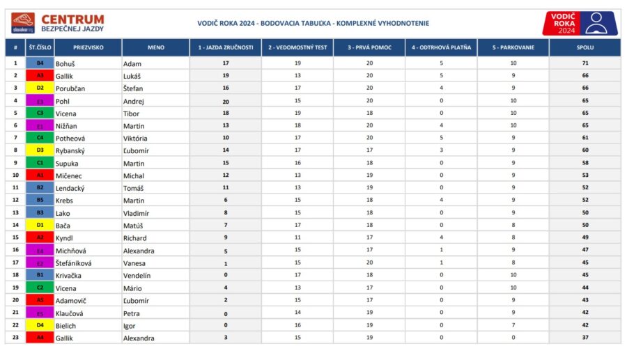 Na konci dňa všetci súťažiaci odchádzali s dobrým pocitom, novými skúsenosťami, ktoré z nich, dúfajme, urobia lepšieho vodiča a s tým, že prežili príjemný deň, ale tiež s malými pozornosťami od partnerov súťaže. A desať najlepších k tomu dostalo zaujímavé vecné ceny. Ako v každej súťaži, víťaz môže byť len jeden. Na treťom mieste sa umiestnil Štefan Porubčan, na druhom Lukáš Gallik, pritom obaja získali rovnaký počet bodov 66, rozhodla jazda zručnosti a v nej bol rýchlejší práve Lukáš. Na prvom miesto so ziskom 71 bodov sa umiestnil a Vodičom roka 2024 sa stal Adam Bohuš.