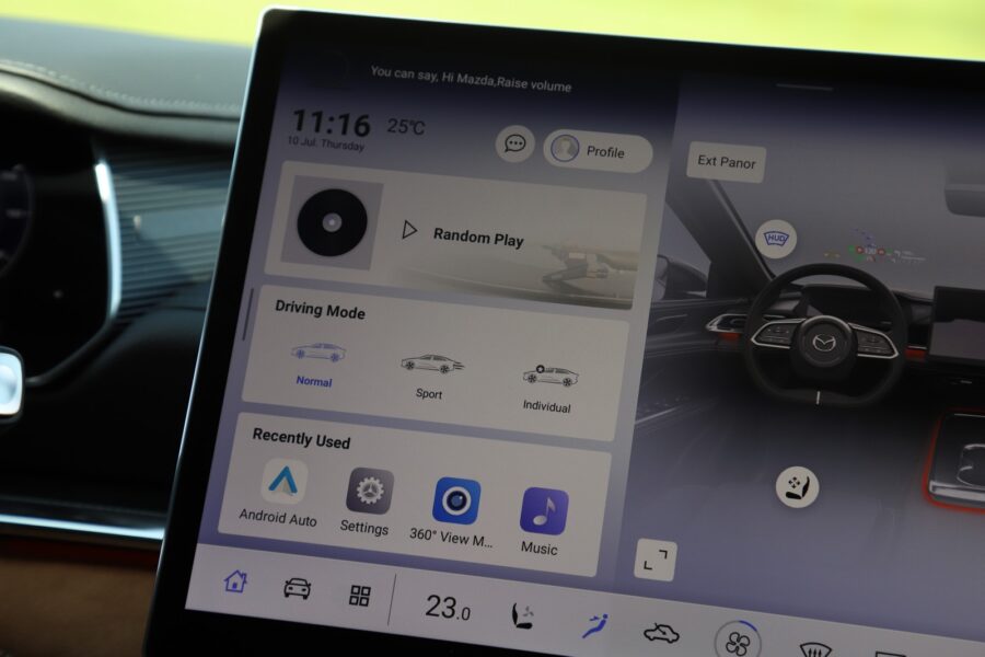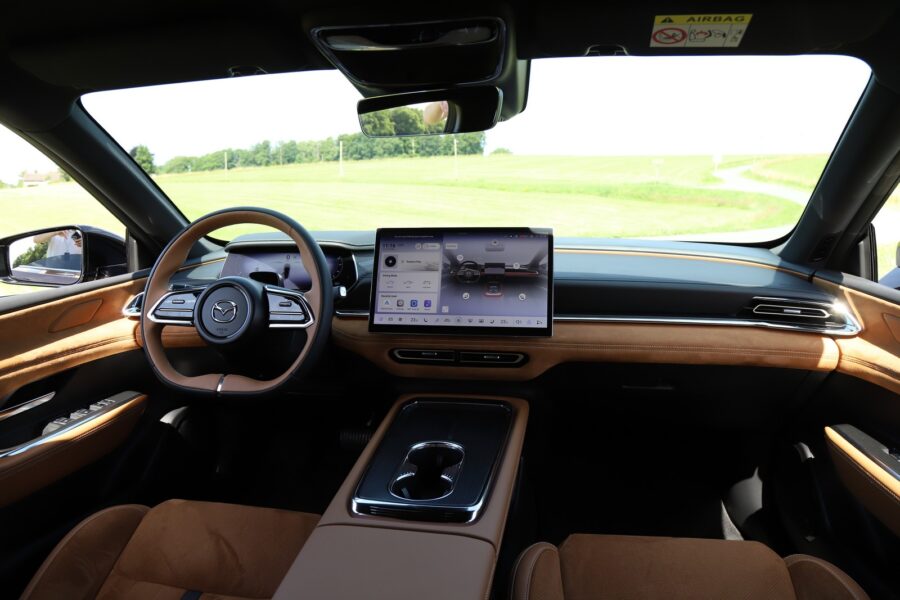 Extra pôsobivý je aj interiér –čistý a minimalistický, bez akýchkoľvek prvkov, ktoré by narúšali jeho jednoliatosť. Druhou stránkou veci je, že všetko ovládate prostredníctvom 14,6-palcového dotykového displeja, a to nie je dobré. O to viac, že na niektoré prvky v menu si musíte zvykať. Napríklad na to, že intenzitu rekuperácie si môžete nastaviť iba v režime Individual. V režime Normal a Sport má auto prednastavenú intenzitu, v oboch režimoch, samozrejme, inú a mne chýbali pádla pod volantom, ktorými by som si mohol meniť stupeň rekuperácie. Na druhej strane, v režime Individual má k dispozícii štyri stupne, pričom v najmenšom stupni Low auto prakticky nerekuperuje a vedel som využívať voľné rolovanie. Auto začalo rekuperovať až počas brzdenia, a to je super. Za zmienku stojí aj ovládanie stieračov – nie páčkou pod volantom, ale tlačidlom na volante. Opakovaným stláčaním „hviezdičky“ na volante zapínate, resp. vypínate stierače, meníte režimy a intenzitu stieračov. Na volante sú však dve „hviezdičkové tlačidlá“ – na to druhé si môžete dať svoju obľúbenú funkciu. Okrem hlasového ovládania v 9 európskych jazykoch Mazda 6e „počúva“ aj na gestá pravej ruky – podobne ako napríklad BMW. Mimochodom, na výber máte tri farebné verzie interiéru – čiernu alebo bielu pre stupeň výbavy Takumi a hnedú pre Takumi Plus.