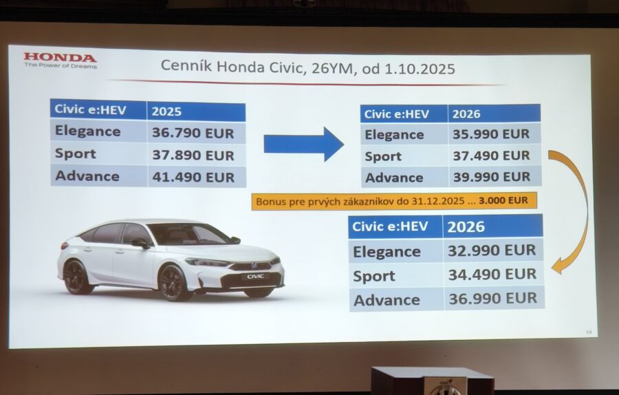 Najlepšiu správu som si nechal na koniec: Faceliftovaný Civic, napriek bohatšej výbave, je lacnejší ako predfaceliftovaný. Základný Civic e:HEV Elegance stál pôvodne 36 790 eur, vo faceliftovanej podobe ju môžete mať za 35 990 eur. Za výbavu Sport ste doteraz museli zaplatiť 37 890 eur, po novom vám stačí 37 490 eur a za top verziu Advance si Honda doteraz pýtala 41 490 eur, teraz už iba 39 990 eur. A to nie je všetko. Pre prvých zákazníkov do 31.12.2025 má Honda špeciálnu akciu, v rámci ktorej na každej výbave ušetríte 3 000 eur. Top verzia – Honda Civic e:HEV Advance – vás teda vyjde na 36 990 eur!