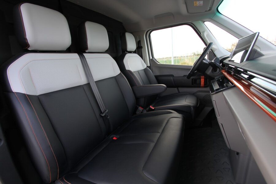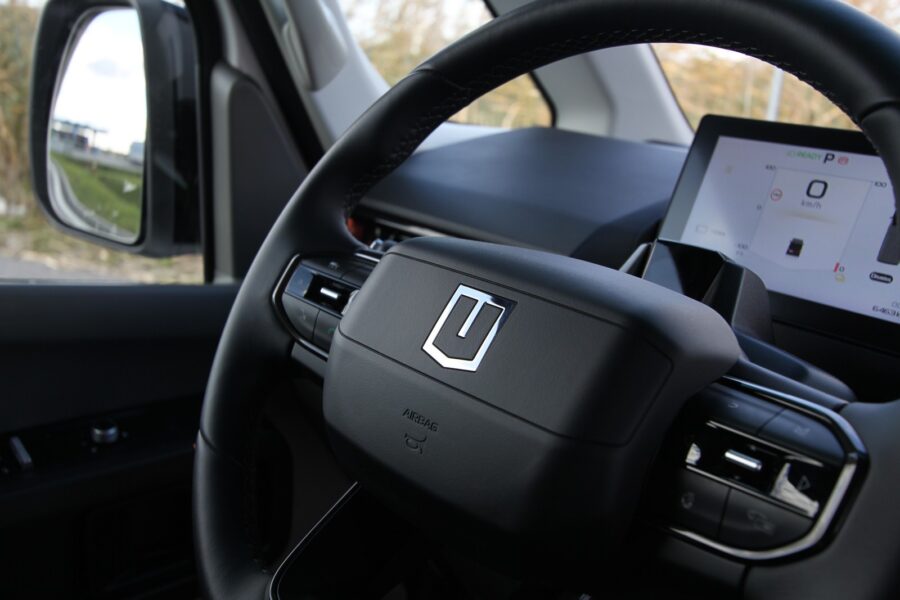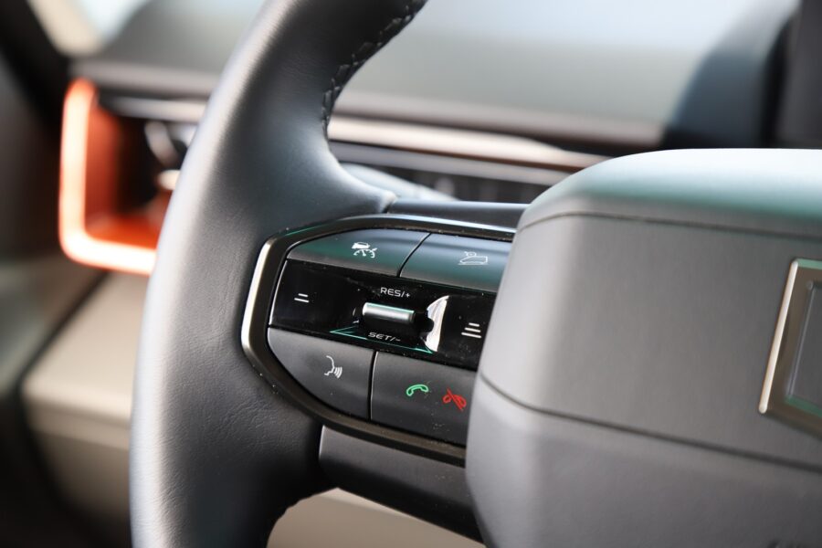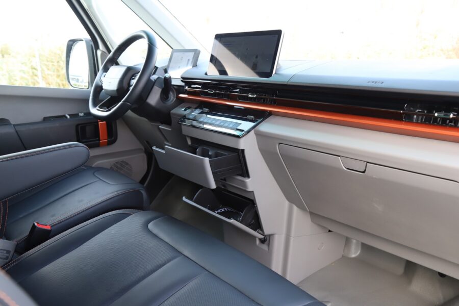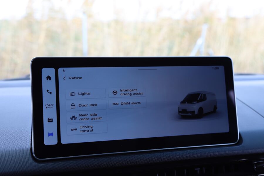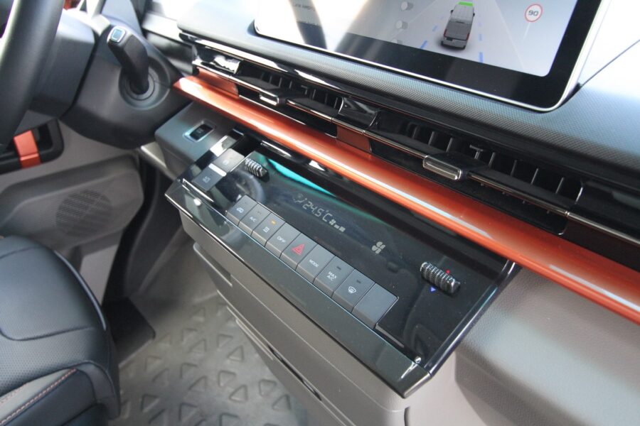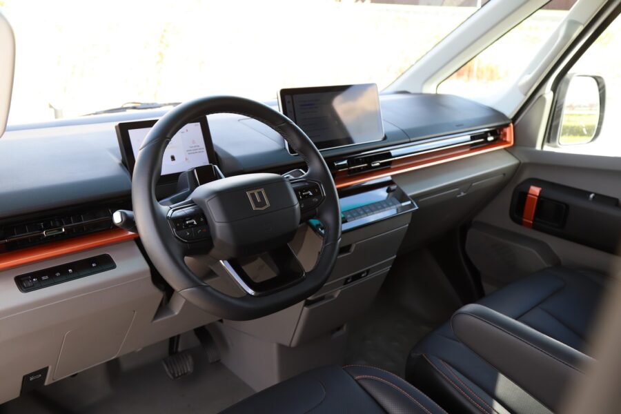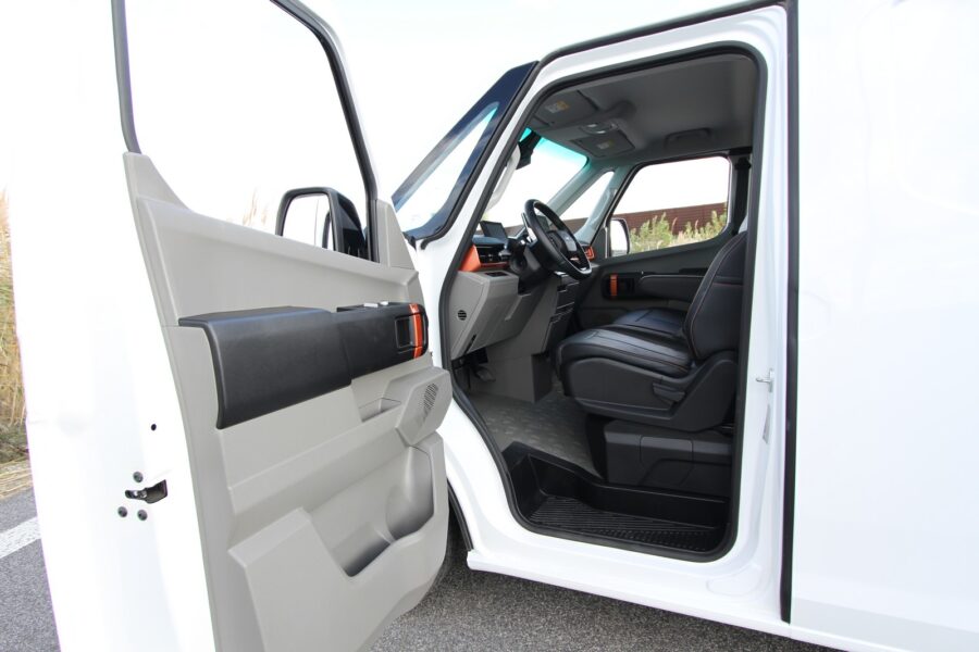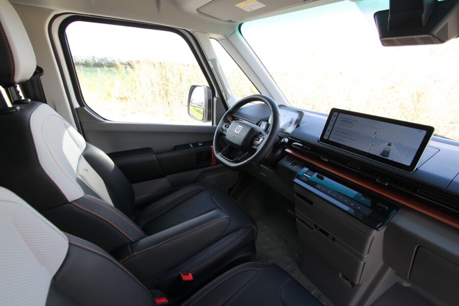 Pracovisko vodiča je civilné a opticky atraktívne. Práve tento trik maskuje použitie tvrdých plastov, takže vás bude lakeť rýchlo omínať. Tento fakt si však pri pohľade na dva displeje, ktoré robia z Farizonu SV osobák, neuvedomíte. Displej prístrojového panelu zobrazuje základné údaje o aute ako napríklad rýchlosť a stav nabitia batérie, prípadne ikony asistenčných systémov a displej infotainmentu zvyšok. Nechýba konektivita vo forme Apple Carplay. Osobitne by som vyzdvihol klasické ovládanie klimatizácie, ktoré je poruke. Nie je tak prepracované ako v európskych autách a gombíky dávajú menej kvalitnejšiu spätnú väzbu. Na druhej strane, je to úžitkové auto a preto je táto kritika nepodstatná. Čo sa vybavenia týka SV ponúka všetko, čo ponúkať má. Vrátane asistenčných systémov. Tie sú príliš horlivé a ich aktivita je neustála. Na konci ani neviete na čo ste boli upozornení. Takže si tieto systémy najskôr vypnete. Za zmienku stojí najmä zdvojený predný stĺpik. Je síce efektný a zrejme sa podieľa aj na vyššej pasívnej bezpečnosti, no výhľad šikmo doľava dosť obmedzuje.