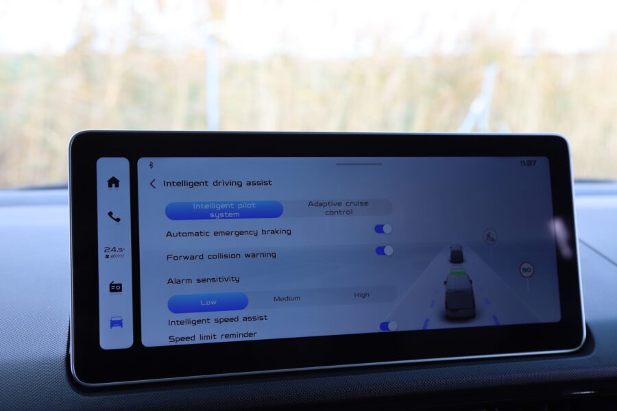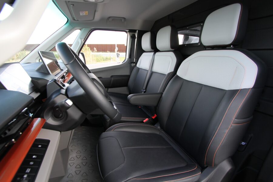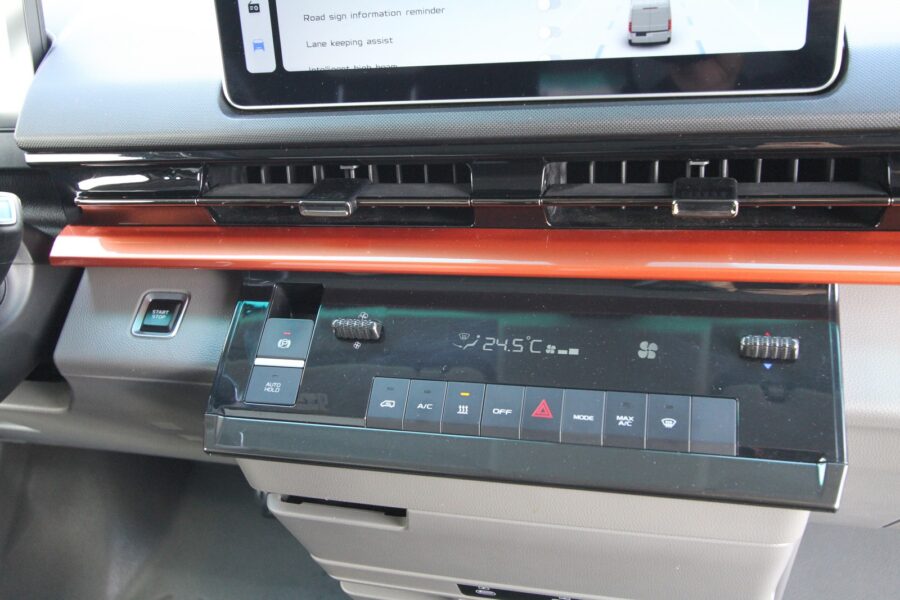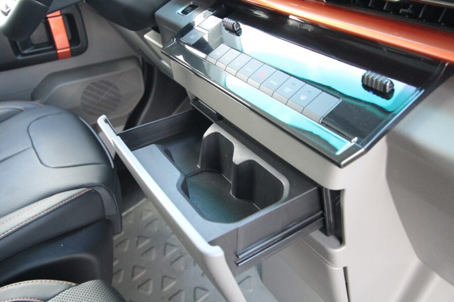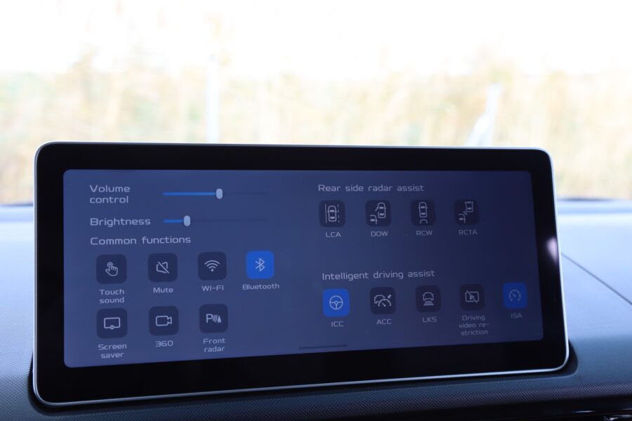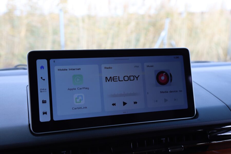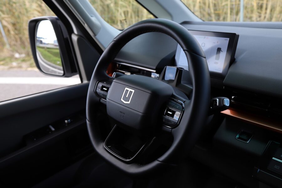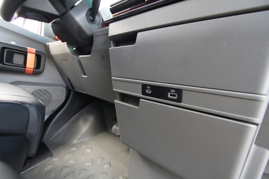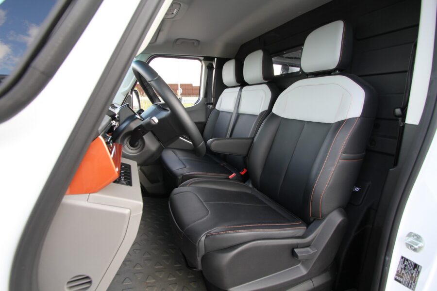 Pracovisko vodiča je civilné a opticky atraktívne. Práve tento trik maskuje použitie tvrdých plastov, takže vás bude lakeť rýchlo omínať. Tento fakt si však pri pohľade na dva displeje, ktoré robia z Farizonu SV osobák, neuvedomíte. Displej prístrojového panelu zobrazuje základné údaje o aute ako napríklad rýchlosť a stav nabitia batérie, prípadne ikony asistenčných systémov a displej infotainmentu zvyšok. Nechýba konektivita vo forme Apple Carplay. Osobitne by som vyzdvihol klasické ovládanie klimatizácie, ktoré je poruke. Nie je tak prepracované ako v európskych autách a gombíky dávajú menej kvalitnejšiu spätnú väzbu. Na druhej strane, je to úžitkové auto a preto je táto kritika nepodstatná. Čo sa vybavenia týka SV ponúka všetko, čo ponúkať má. Vrátane asistenčných systémov. Tie sú príliš horlivé a ich aktivita je neustála. Na konci ani neviete na čo ste boli upozornení. Takže si tieto systémy najskôr vypnete. Za zmienku stojí najmä zdvojený predný stĺpik. Je síce efektný a zrejme sa podieľa aj na vyššej pasívnej bezpečnosti, no výhľad šikmo doľava dosť obmedzuje.