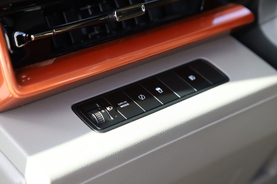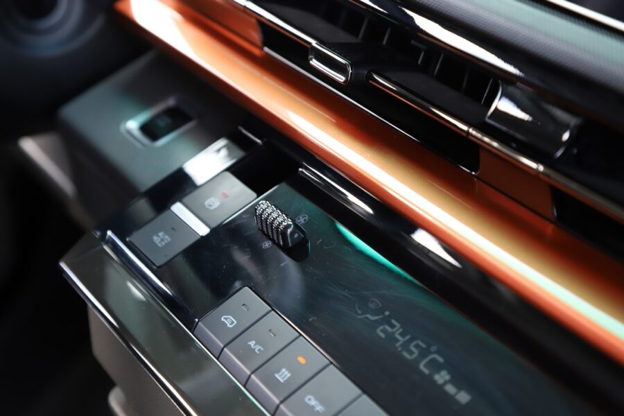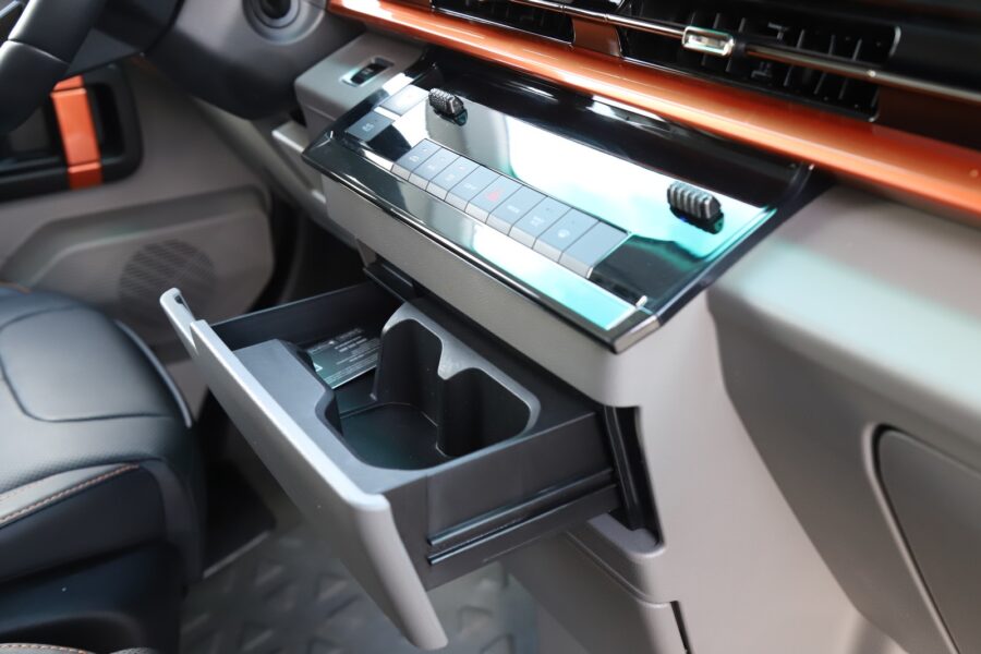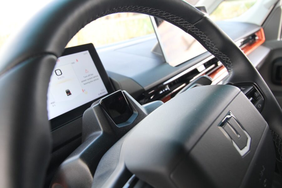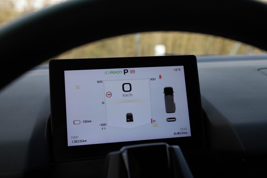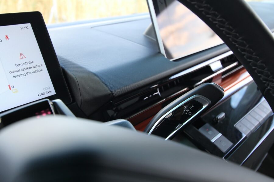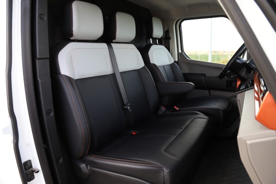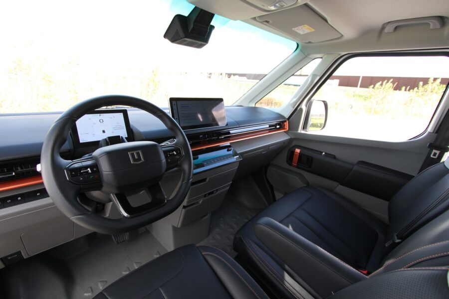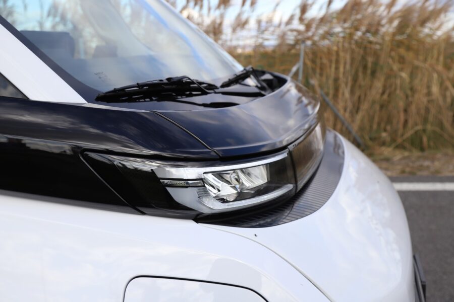 Pracovisko vodiča je civilné a opticky atraktívne. Práve tento trik maskuje použitie tvrdých plastov, takže vás bude lakeť rýchlo omínať. Tento fakt si však pri pohľade na dva displeje, ktoré robia z Farizonu SV osobák, neuvedomíte. Displej prístrojového panelu zobrazuje základné údaje o aute ako napríklad rýchlosť a stav nabitia batérie, prípadne ikony asistenčných systémov a displej infotainmentu zvyšok. Nechýba konektivita vo forme Apple Carplay. Osobitne by som vyzdvihol klasické ovládanie klimatizácie, ktoré je poruke. Nie je tak prepracované ako v európskych autách a gombíky dávajú menej kvalitnejšiu spätnú väzbu. Na druhej strane, je to úžitkové auto a preto je táto kritika nepodstatná. Čo sa vybavenia týka SV ponúka všetko, čo ponúkať má. Vrátane asistenčných systémov. Tie sú príliš horlivé a ich aktivita je neustála. Na konci ani neviete na čo ste boli upozornení. Takže si tieto systémy najskôr vypnete. Za zmienku stojí najmä zdvojený predný stĺpik. Je síce efektný a zrejme sa podieľa aj na vyššej pasívnej bezpečnosti, no výhľad šikmo doľava dosť obmedzuje.