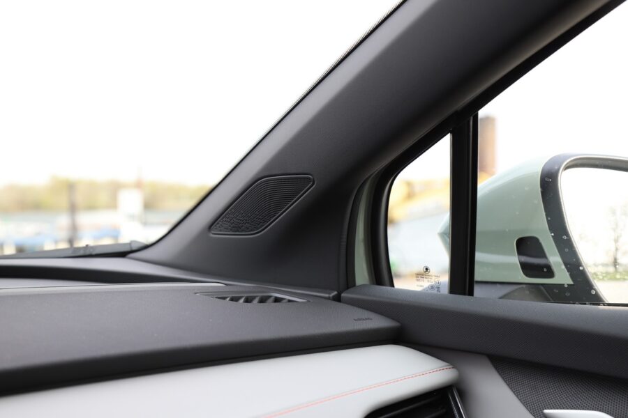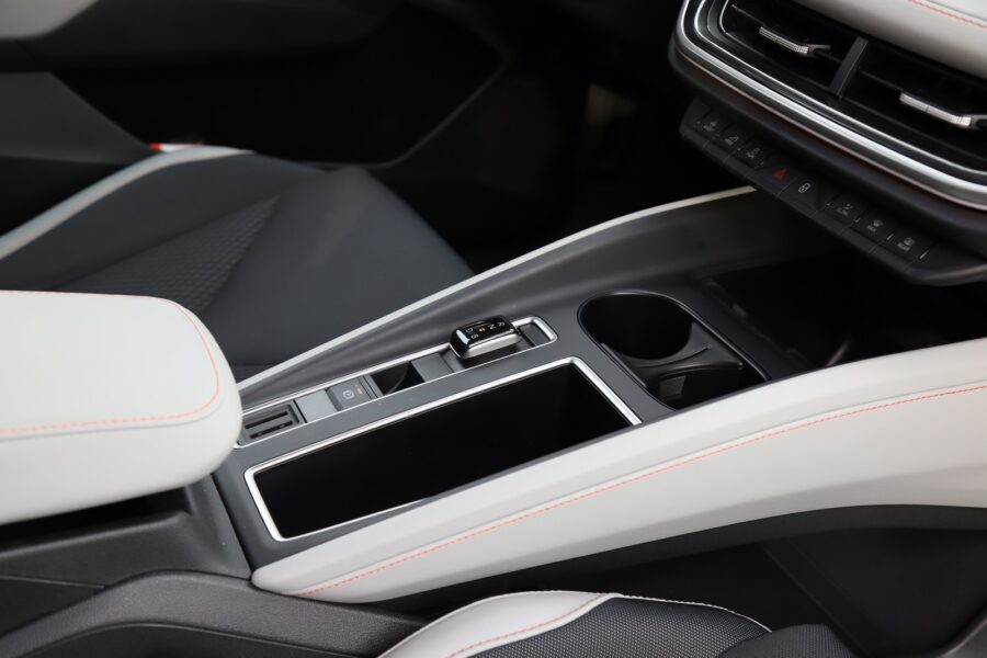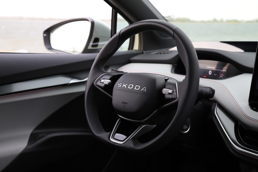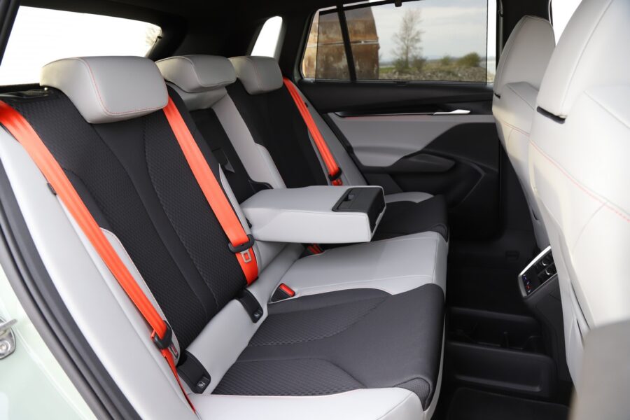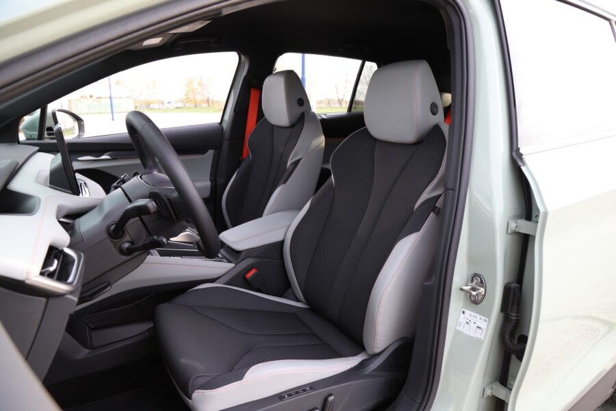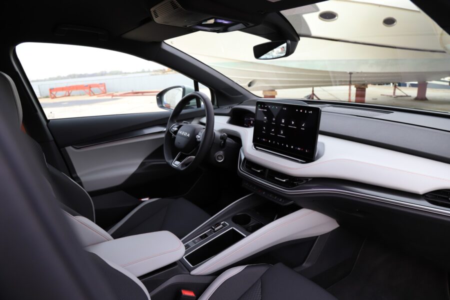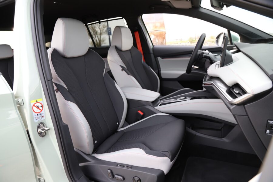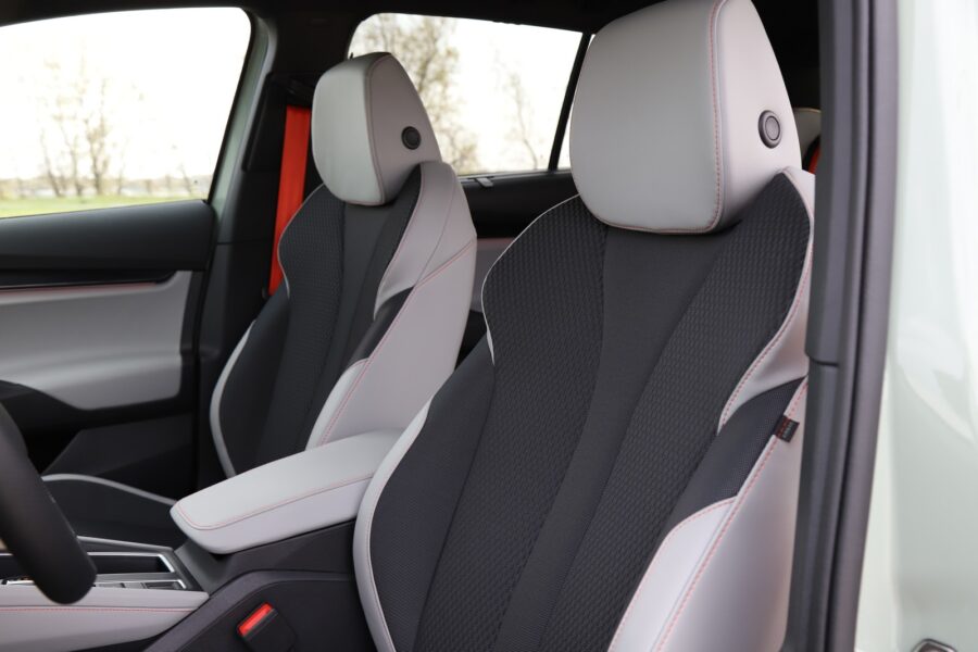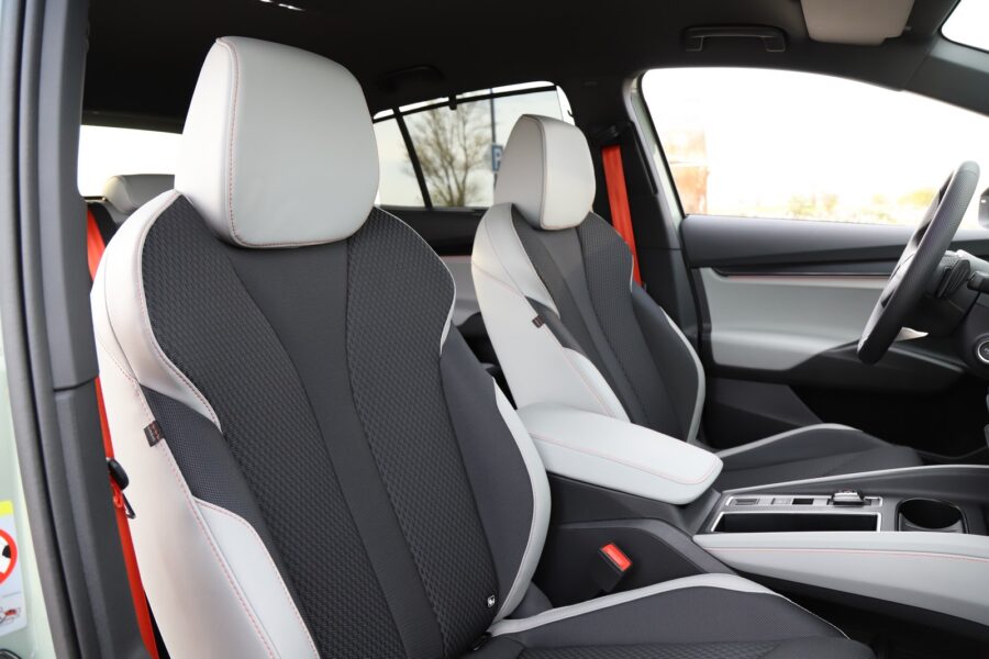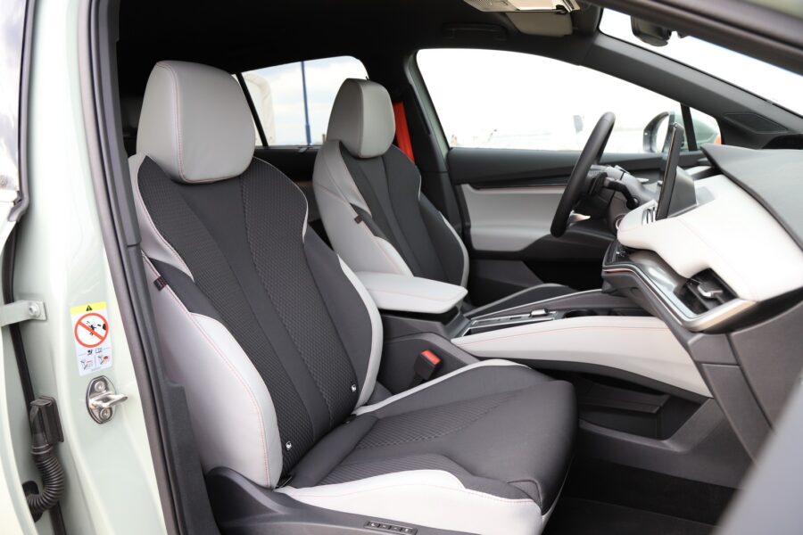 Začína sa to, samozrejme, optikou. V prvom rade peknými 21-palcovými diskami Supernova a elegantnou farbou zelená Timiano, ktoré udrú do očí ako prvé. To najlepšie vás však čaká vo vnútri, presne tam, kde na tom záleží, pretože práve interiér budete vnímať pri každej jednej jazde. Testovaný Elroq mal interiér Lodge, ktorý kombinuje bielu umelú kožu s čiernou látkou a oranžovým prešitím, oranžové bezpečnostné pásy a čierny strop.
