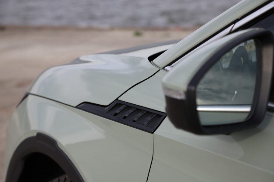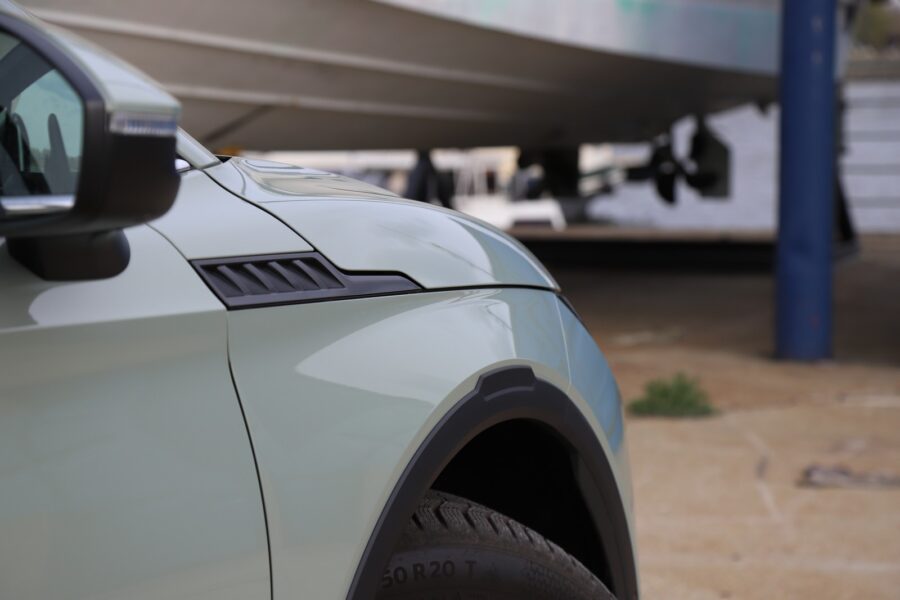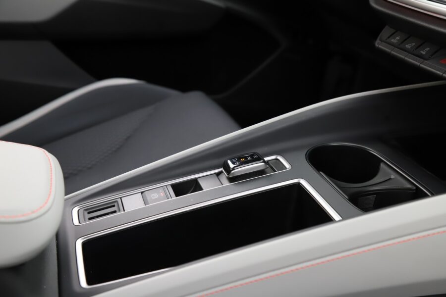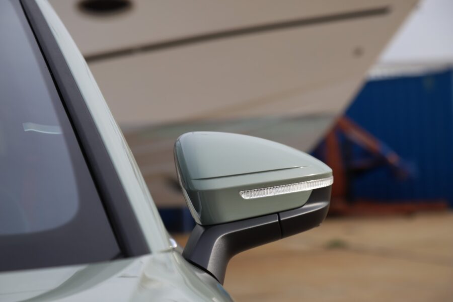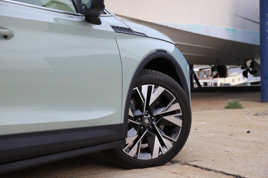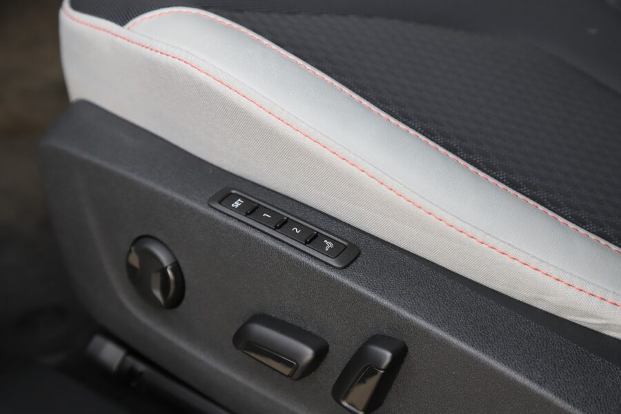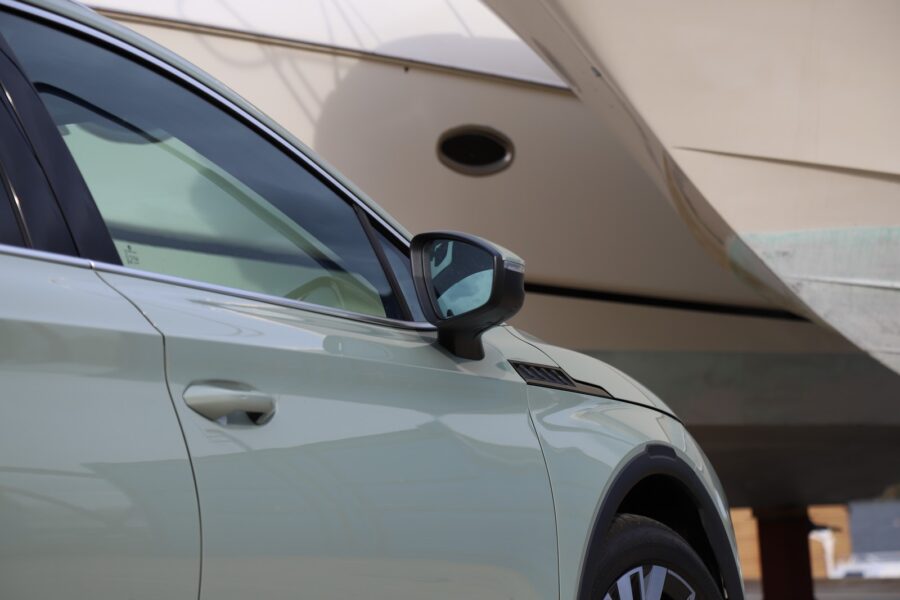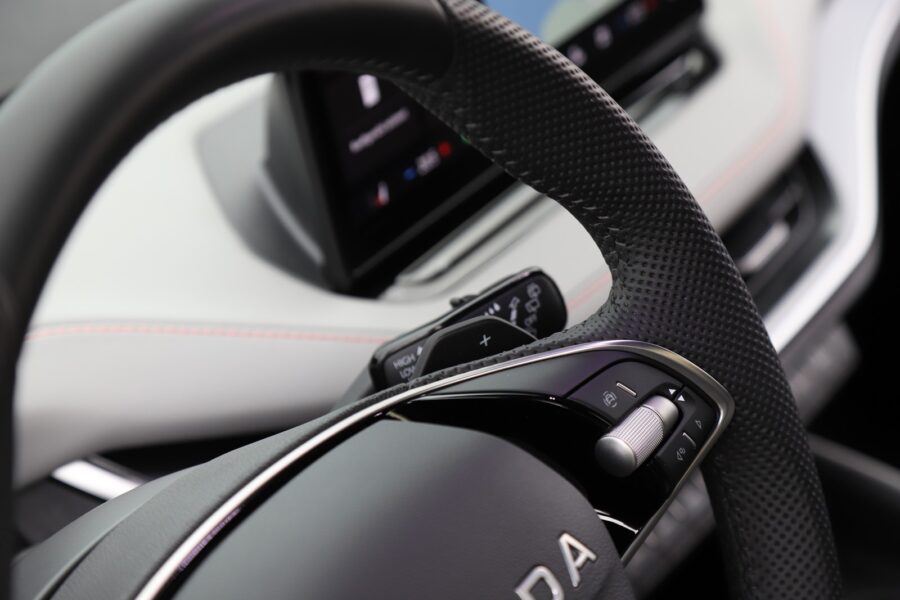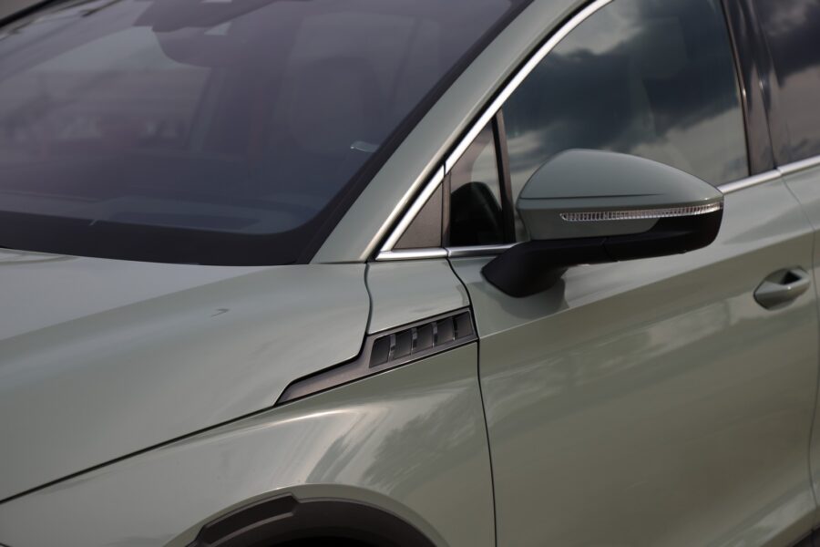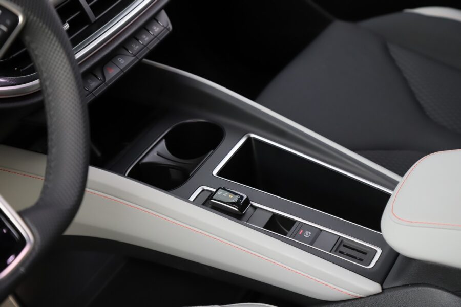 Začína sa to, samozrejme, optikou. V prvom rade peknými 21-palcovými diskami Supernova a elegantnou farbou zelená Timiano, ktoré udrú do očí ako prvé. To najlepšie vás však čaká vo vnútri, presne tam, kde na tom záleží, pretože práve interiér budete vnímať pri každej jednej jazde. Testovaný Elroq mal interiér Lodge, ktorý kombinuje bielu umelú kožu s čiernou látkou a oranžovým prešitím, oranžové bezpečnostné pásy a čierny strop.