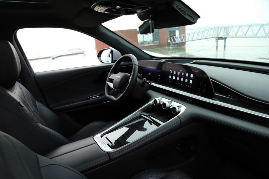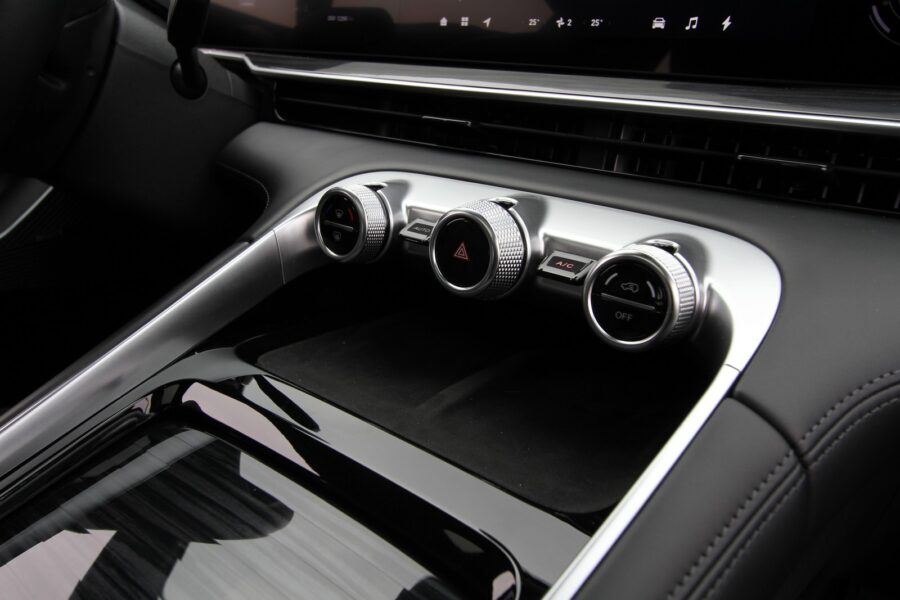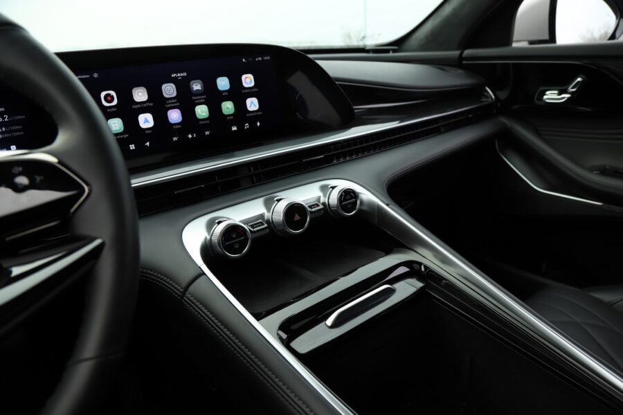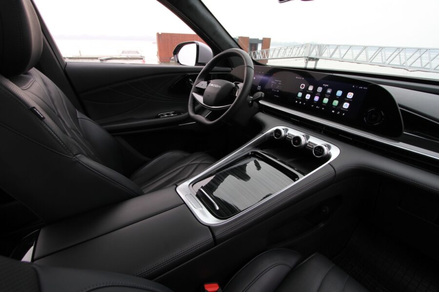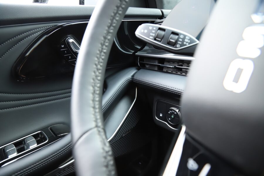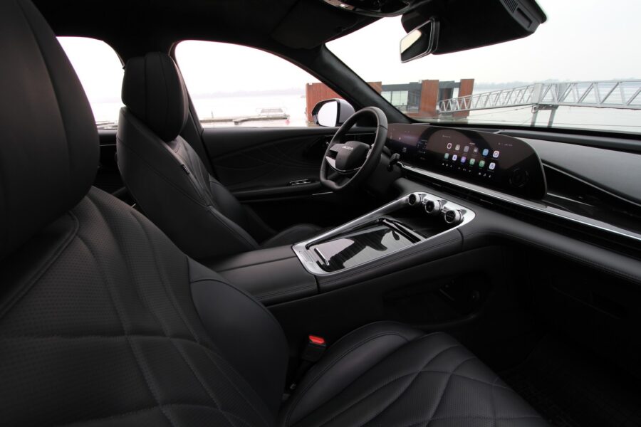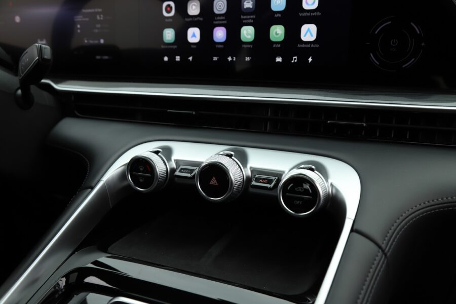 V interiéri vás zaujme zakrivený širokouhlý displej s uhlopriečkou 25,6 palca, mohutný a vysoký stredový tunel, ktorý plynule prechádza do prístrojovej dosky, ale absolútnu dominanciu na seba preberá trojica otočných ovládačov. Nielen preto, že sú veľké a pekne spracované, ale aj preto, že dnes už takéto – a vlastne žiadne – ovládače nevídame. Namiesto nich máme bezduché displeje.