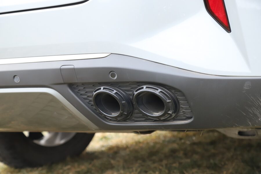Čo sa týka samotného dizajnu, cítiť, že Omoda ide po európskych zákazníkoch. Zaujímavosťou sú dve mohutné zdvojené koncovky výfuku, ktoré vyzerajú, akoby ste mali pod kapotou nejaký parádny osemvalec. Ale žiaľ, realita je iná, ani pod kapotou nie je osemvalec a aj tie výfuky sú iba atrapy. Skutočný výfuk je pod nárazníkom a smeruje k zemi, aspoňže sú dve koncovky – po jednej na každej strane.