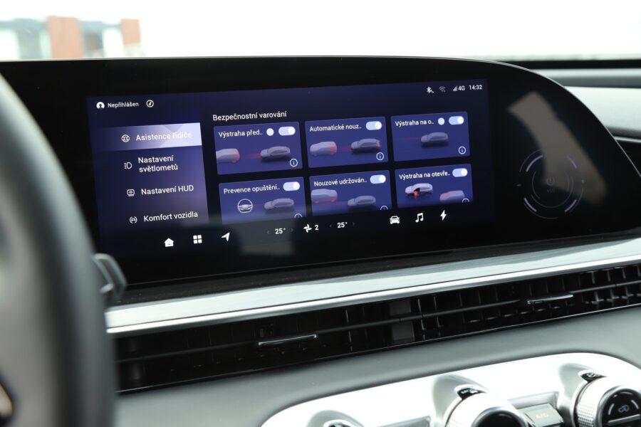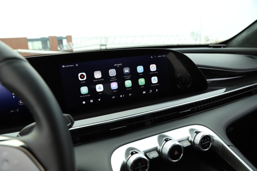Prekvapia funkciou, dve krajné slúžia na nastavenie teploty v pravej a ľavej časti interiéru, ten stredný nepatrí klimatizácii, ale slúži na výber jazdného režimu. Ďalšie základné funkcie klimatizácie – vyhrievanie čelného a zadného okna, vnútornú cirkuláciu a vypnutie systému – ovládate tlačidlami v strede krajných ovládačov, funkciu Auto a AC samostatnými tlačidlami a zvyšok cez dotykový displej. Škoda, že sa otáčkam ventilátora a nastaveniu smerovania temperovaného vzduchu neušiel priamy ovládač. Musím pochváliť, že celý interiér pôsobí mimoriadne kvalitne. Lícovanie, prešitie, použité materiály, pevnosť plastov… všetko pôsobí prémiovo. A prémiovo znie aj audiosústava SONY so 14 reproduktormi a prémiovo pôsobí aj elektrické otváranie dverí zvnútra.