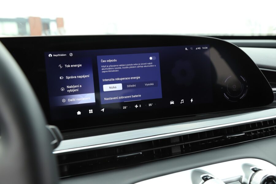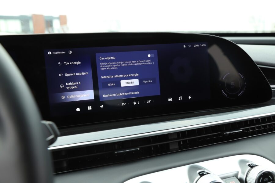 Mňa na celom systéme otravovala jediná vec – auto sa zakaždým zobúdzalo v režime ECO a so strednou úrovňou rekuperácie. Ten režim si zmeníte veľmi jednoducho otočením stredného otočného ovládača, ale rekuperáciu treba meniť v menu dotykového displeja. A to je otravné. Aby som to doplnil, k dispozícii máte tri úrovne, no pre mňa dávala zmysel iba tá najnižšia. Pri ostatných dvoch si človek musí neustále strážiť pravú nohu, aby auto nespomaľovalo príliš silno a „dorolovalo“ tam, kam chcete, a to mi nevyhovuje. Mimochodom, Omoda pri rekuperácii využíva oba elektromotory, tak si viete predstaviť to spomalenie pri uvoľnení plynu na tretej úrovni rekuperácie.
