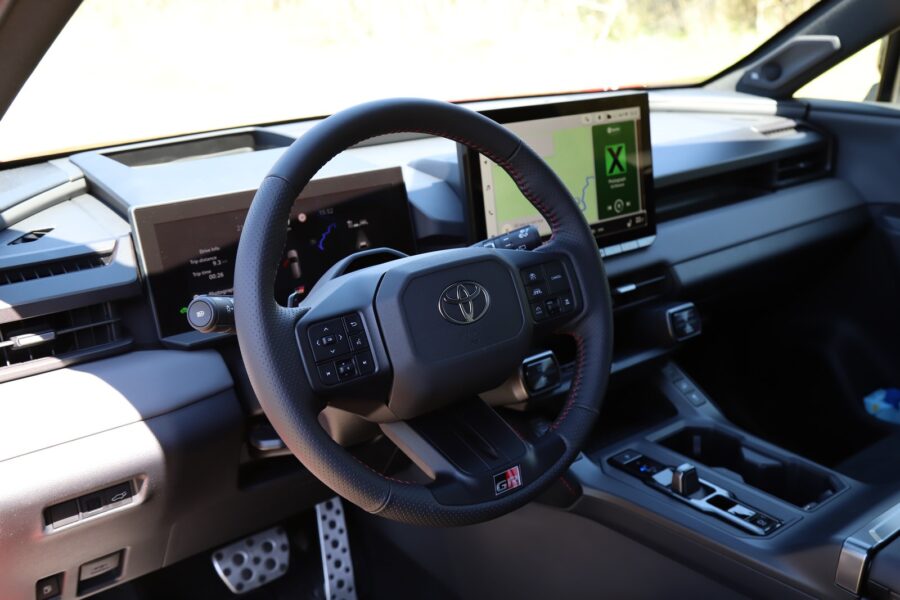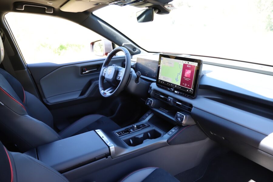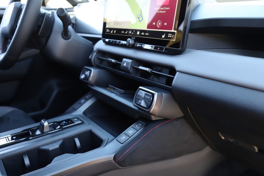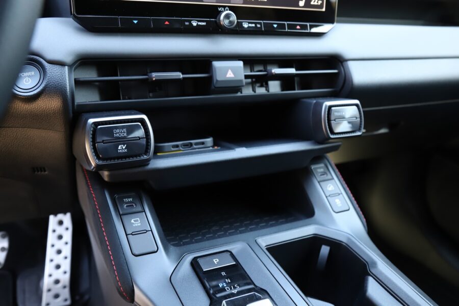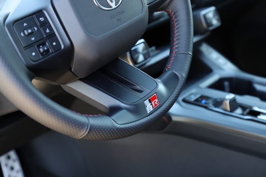 Interiér si zachoval výrazné tvary s mohutnými prvkami odkazujúcimi na robustnosť. Takými sú napríklad tlačidlá voľby jazdných a off-roadových režimov. Z môjho pohľadu je na škodu veci, že Toyota upustila od hardvérových ovládačov klimatizácie. Tú ovládate cez 12,9-palcový dotykový displej. Priamo pred vodičom je 12,3-palcový digitálny prístrojový štít.