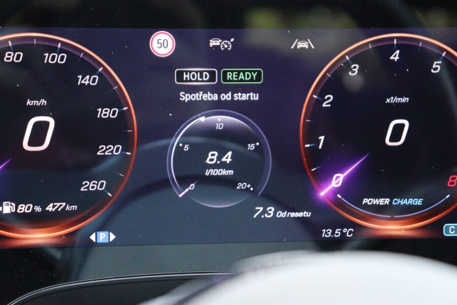 Poďme rovno k pohonu. Pod kapotou sa skrýva motor s objemom 1,5 litra, ktorý síce vyvinuli v Nemecku, no montuje sa v Číne. Tento motor má kompresný pomer 12:1 a pracuje v Millerovom cykle. Elektrickú prácu vykonáva 30-koňový elektromotor, integrovaný do novej osemstupňovej dvojspojkovej prevodovky s označením 8G-eDCT. Čerpá energiu z 1,3 kWh batérie. Tieto údaje možno nie sú oslnivé, ale elektromotor dopuje dodatočných 200 Nm.
