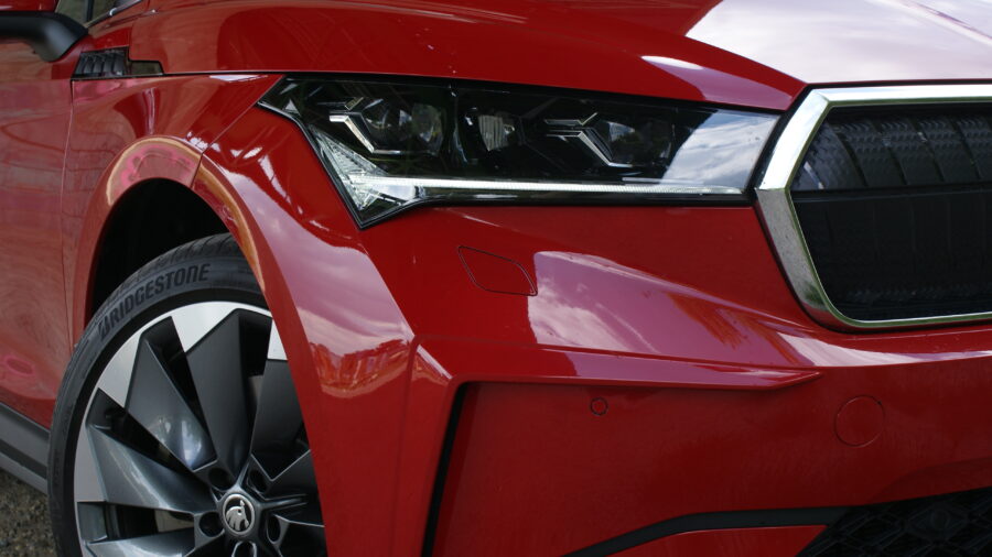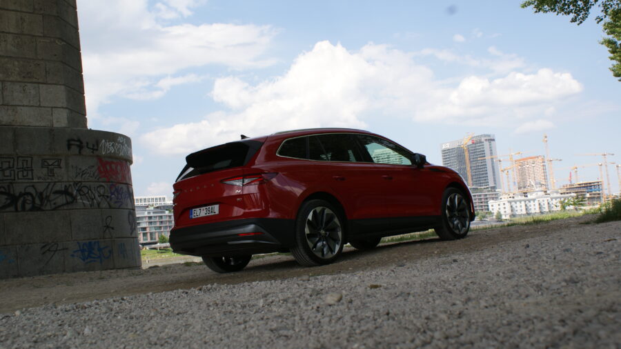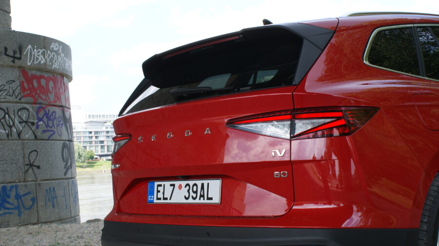 Vďaka nej, ale aj vďaka šikovnému zapracovaniu množstva prelisov si Enyaq iV dokáže pozoruhodne poradiť so zvýšeným odporom vzduchu. Pri pohľade na zadnú časť však už toľko odvahy nebadať. Skôr by som povedal, že dizajnéri stavili na eleganciu a zostali konzervatívnejší. Možno aj preto, že veľké 21-palcové disky kolies priťahujú pozornosť okoloidúcich dostatočne. Vo výsledku je teda Škoda Enyaq iV v mojich očiach dizajnovo podareným autom. Bez ohľadu na to, že ide o elektromobil, pôsobí dojmom honosného SUV. Mne osobne sa mimoriadne páčila aj červená metalíza s názvom Velvet, za ktorú si výrobca pýta príplatok 1 056 eur.