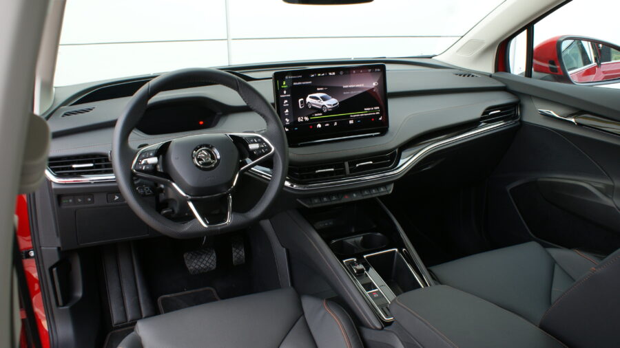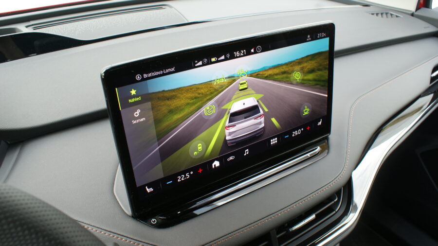 Pred vodičom sa nachádza malý displej, ktorý zobrazuje naozaj iba základné údaje. Tento fakt mi neprekážal, keďže som mal k dispozícii aj rozmerný head-up displej, kde som videl ďalšie informácie. Elektrické SUV sa dokonca môže pochváliť ultramoderným head-up displejom s funkciou rozšírenej reality, čo posúva Enyaq iV z technologického pohľadu na špičku v segmente. Prístrojová doska potiahnutá kožou s pekným prešívaním láka dotknúť sa jej. Zároveň je minimalistická s jedným dominantným prvkom. Veľký 13-palcový dotykový displej stojí uprostred. Chválim logiku softvéru i grafické spracovanie, no prekážalo mi, že bezprostredne po štarte mávala obrazovka dlhý rozbeh. Naopak, páčila sa mi lišta s hardvérovými tlačidlami, ktoré slúžili ako skratky k najbežnejším funkciám. Pod lištou sa zároveň nachádza miesto na odloženie mobilu s bezdrôtovým nabíjaním a na dvojicu USB-C portov. Bližšie k posádke objavujem dva držiaky na poháre a ďalšiu úložnú schránku. To sú veci, ktoré vám na prvý pohľad pripadajú ako detaily, no rodinné SUV skrátka musí byť praktické.